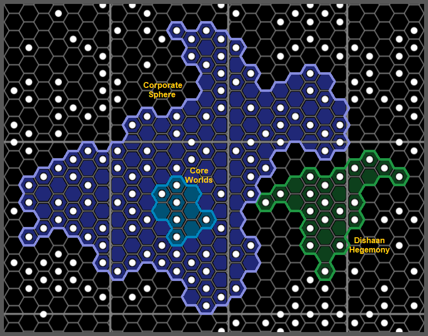 - REMARKS: A basic map showing worlds that were variously considered under the influence of or directly controlled by the Darmine Corporate or the Dishaan Hegemony within Zarushagar Sector.
